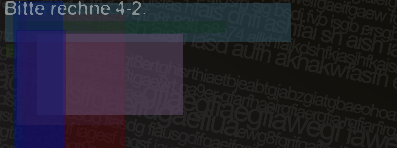 Die Visuelle Bestätigung hilft dabei automatische Spambots und Scripte von den Diensten dieses Forums abzuhalten. Derartige Scripte sind normalerweise nicht in der Lage den untenstehenden Code zu erkennen. Bitte geben Sie also in das untenstehende Feld die Buchstaben und Zahlen ein, die Sie in dem Bild erkennen können oder beantworten Sie die angezeigte Frage.