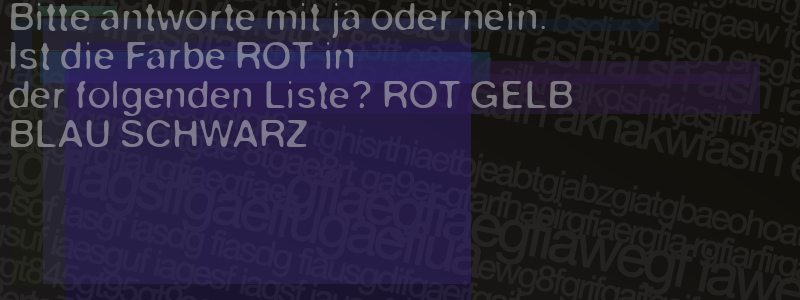 Die Visuelle Bestätigung hilft dabei automatische Spambots und Scripte von den Diensten dieses Forums abzuhalten. Derartige Scripte sind normalerweise nicht in der Lage den untenstehenden Code zu erkennen. Bitte geben Sie also in das untenstehende Feld die Buchstaben und Zahlen ein, die Sie in dem Bild erkennen können oder beantworten Sie die angezeigte Frage.