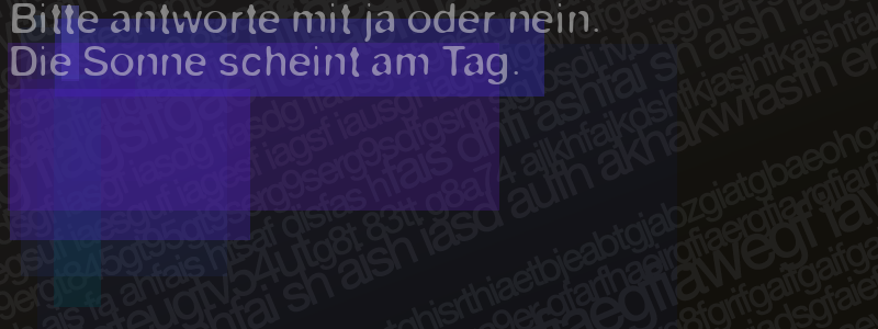 Die Visuelle Bestätigung hilft dabei automatische Spambots und Scripte von den Diensten dieses Forums abzuhalten. Derartige Scripte sind normalerweise nicht in der Lage den untenstehenden Code zu erkennen. Bitte geben Sie also in das untenstehende Feld die Buchstaben und Zahlen ein, die Sie in dem Bild erkennen können oder beantworten Sie die angezeigte Frage.