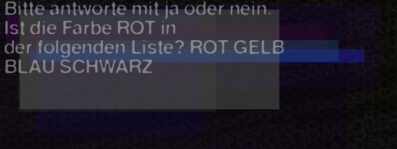 Die Visuelle Bestätigung hilft dabei automatische Spambots und Scripte von den Diensten dieses Forums abzuhalten. Derartige Scripte sind normalerweise nicht in der Lage den untenstehenden Code zu erkennen. Bitte geben Sie also in das untenstehende Feld die Buchstaben und Zahlen ein, die Sie in dem Bild erkennen können oder beantworten Sie die angezeigte Frage.