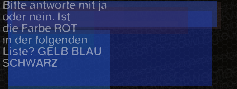 Die Visuelle Bestätigung hilft dabei automatische Spambots und Scripte von den Diensten dieses Forums abzuhalten. Derartige Scripte sind normalerweise nicht in der Lage den untenstehenden Code zu erkennen. Bitte geben Sie also in das untenstehende Feld die Buchstaben und Zahlen ein, die Sie in dem Bild erkennen können oder beantworten Sie die angezeigte Frage.