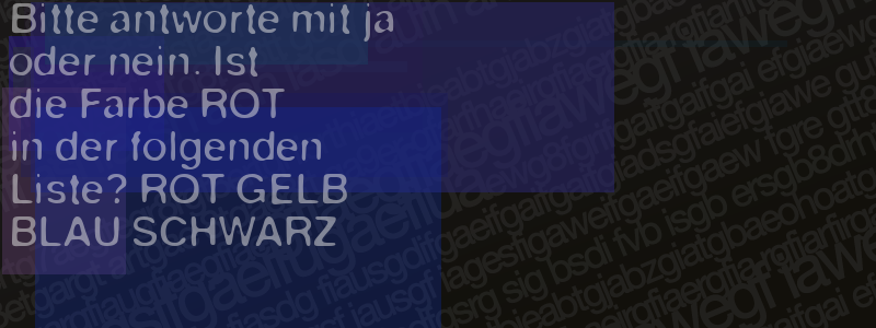 Die Visuelle Bestätigung hilft dabei automatische Spambots und Scripte von den Diensten dieses Forums abzuhalten. Derartige Scripte sind normalerweise nicht in der Lage den untenstehenden Code zu erkennen. Bitte geben Sie also in das untenstehende Feld die Buchstaben und Zahlen ein, die Sie in dem Bild erkennen können oder beantworten Sie die angezeigte Frage.