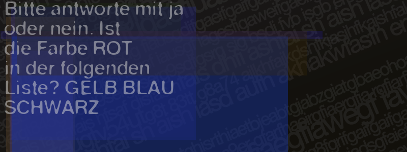 Die Visuelle Bestätigung hilft dabei automatische Spambots und Scripte von den Diensten dieses Forums abzuhalten. Derartige Scripte sind normalerweise nicht in der Lage den untenstehenden Code zu erkennen. Bitte geben Sie also in das untenstehende Feld die Buchstaben und Zahlen ein, die Sie in dem Bild erkennen können oder beantworten Sie die angezeigte Frage.