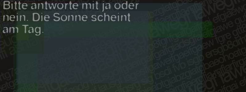Die Visuelle Bestätigung hilft dabei automatische Spambots und Scripte von den Diensten dieses Forums abzuhalten. Derartige Scripte sind normalerweise nicht in der Lage den untenstehenden Code zu erkennen. Bitte geben Sie also in das untenstehende Feld die Buchstaben und Zahlen ein, die Sie in dem Bild erkennen können oder beantworten Sie die angezeigte Frage.