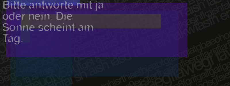 Die Visuelle Bestätigung hilft dabei automatische Spambots und Scripte von den Diensten dieses Forums abzuhalten. Derartige Scripte sind normalerweise nicht in der Lage den untenstehenden Code zu erkennen. Bitte geben Sie also in das untenstehende Feld die Buchstaben und Zahlen ein, die Sie in dem Bild erkennen können oder beantworten Sie die angezeigte Frage.