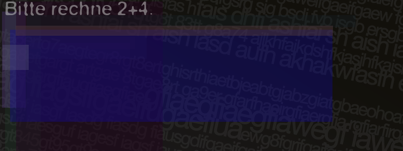 Die Visuelle Bestätigung hilft dabei automatische Spambots und Scripte von den Diensten dieses Forums abzuhalten. Derartige Scripte sind normalerweise nicht in der Lage den untenstehenden Code zu erkennen. Bitte geben Sie also in das untenstehende Feld die Buchstaben und Zahlen ein, die Sie in dem Bild erkennen können oder beantworten Sie die angezeigte Frage.