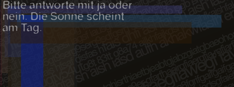 Die Visuelle Bestätigung hilft dabei automatische Spambots und Scripte von den Diensten dieses Forums abzuhalten. Derartige Scripte sind normalerweise nicht in der Lage den untenstehenden Code zu erkennen. Bitte geben Sie also in das untenstehende Feld die Buchstaben und Zahlen ein, die Sie in dem Bild erkennen können oder beantworten Sie die angezeigte Frage.