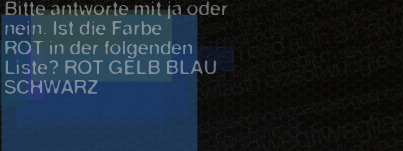Die Visuelle Bestätigung hilft dabei automatische Spambots und Scripte von den Diensten dieses Forums abzuhalten. Derartige Scripte sind normalerweise nicht in der Lage den untenstehenden Code zu erkennen. Bitte geben Sie also in das untenstehende Feld die Buchstaben und Zahlen ein, die Sie in dem Bild erkennen können oder beantworten Sie die angezeigte Frage.