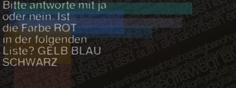 Die Visuelle Bestätigung hilft dabei automatische Spambots und Scripte von den Diensten dieses Forums abzuhalten. Derartige Scripte sind normalerweise nicht in der Lage den untenstehenden Code zu erkennen. Bitte geben Sie also in das untenstehende Feld die Buchstaben und Zahlen ein, die Sie in dem Bild erkennen können oder beantworten Sie die angezeigte Frage.