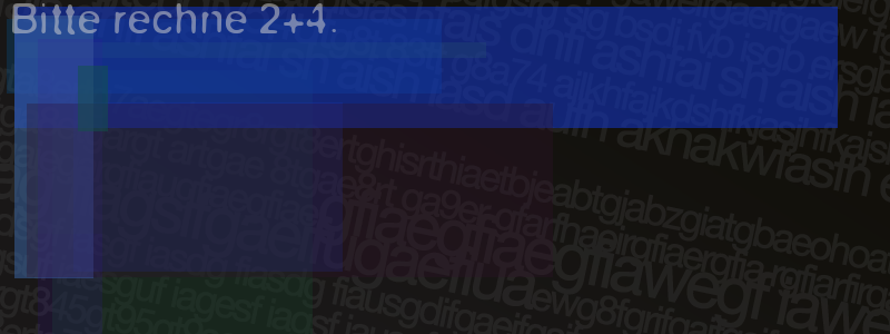 Die Visuelle Bestätigung hilft dabei automatische Spambots und Scripte von den Diensten dieses Forums abzuhalten. Derartige Scripte sind normalerweise nicht in der Lage den untenstehenden Code zu erkennen. Bitte geben Sie also in das untenstehende Feld die Buchstaben und Zahlen ein, die Sie in dem Bild erkennen können oder beantworten Sie die angezeigte Frage.