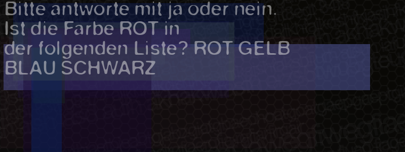 Die Visuelle Bestätigung hilft dabei automatische Spambots und Scripte von den Diensten dieses Forums abzuhalten. Derartige Scripte sind normalerweise nicht in der Lage den untenstehenden Code zu erkennen. Bitte geben Sie also in das untenstehende Feld die Buchstaben und Zahlen ein, die Sie in dem Bild erkennen können oder beantworten Sie die angezeigte Frage.