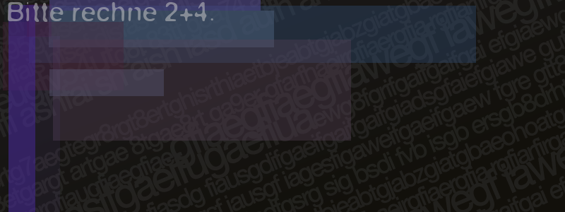 Die Visuelle Bestätigung hilft dabei automatische Spambots und Scripte von den Diensten dieses Forums abzuhalten. Derartige Scripte sind normalerweise nicht in der Lage den untenstehenden Code zu erkennen. Bitte geben Sie also in das untenstehende Feld die Buchstaben und Zahlen ein, die Sie in dem Bild erkennen können oder beantworten Sie die angezeigte Frage.