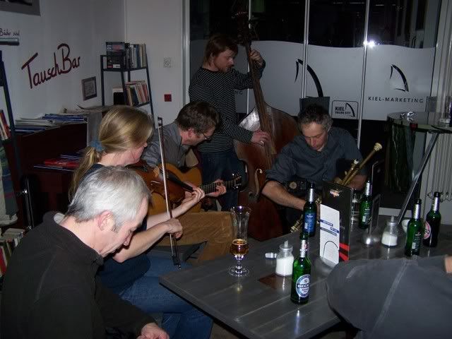 Nach den Zugaben, wurde von Dag angekündigt, dass man im Restaurant noch ein bißchen mit Kieler Folkmusikern, die ihre Instrumente mitgebracht haben, jammen würde. Es wurde ein langer Abend: