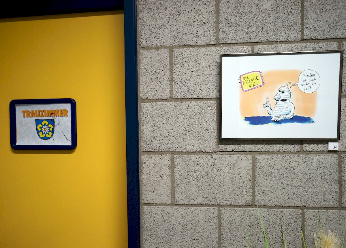Aus unserer aktuellen Rathaus-Ausstellung, ...hängt rechts von der Tür zum Trauzimmer. Da soll jemand sagen, Standesbeamte/innen hätten keinen Humor.